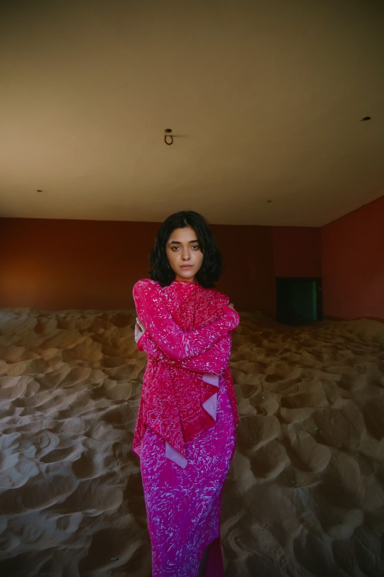 With the influence of Pakistan and England in her childhood, this merged together in Hadiyah’s fusion collections. The western influence comes through in the more westernised shapes and silhouettes. ‘My family often says, “she makes clothes for Goriyan, she makes nangay kupre”’. But balanced alongside these western silhouettes, Hadiyah weaves in her culture with stories from her family and heritage. Storytelling ‘through language; Urdu and Arabic, through my community, through my friends’ everything gets incorporated into her pieces. Intertwined are stories of her Nani’s migration, and sisterhood. All a reflection of her Pakistani heritage that becomes translated directly into her work.