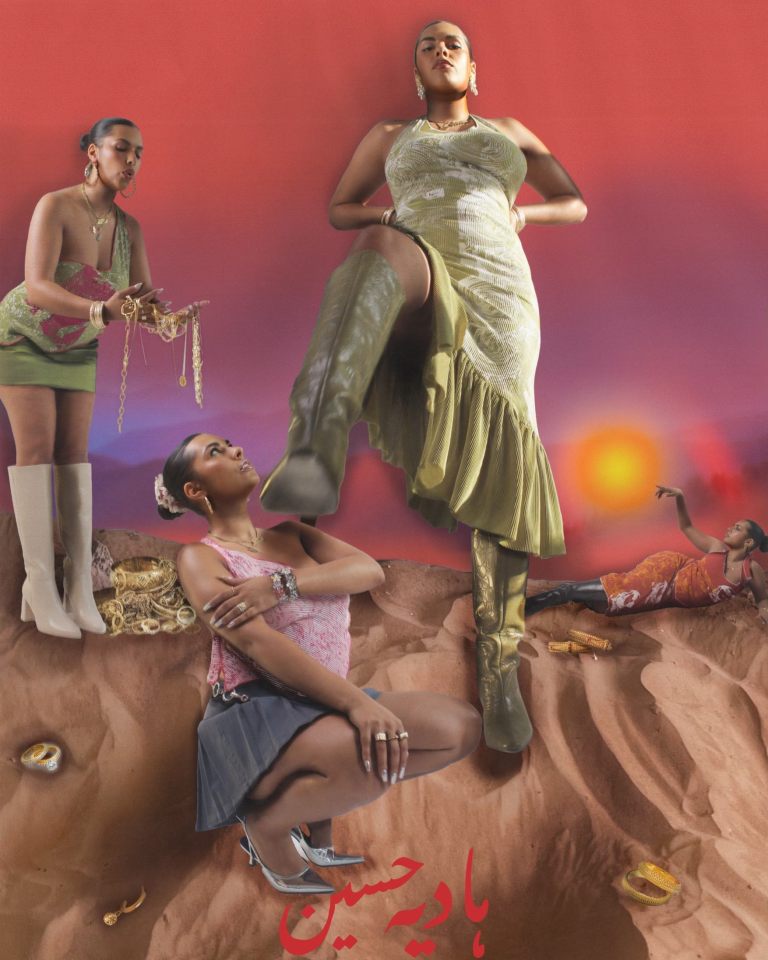 Hadiyah has been releasing collections since 2021, when she started her brand. Her first, ‘The Sisterhood Collection’ derives from her university days – a collaboration with Swarovski called ‘Beauty Encrusted’. The purpose behind the collection was to equate ‘being beautiful to being modest as well, there’s so much beauty in modesty’. This print was a celebration of that. People often get uncomfortable around this idea, Hadiyah wanted to confront this. ‘I got a lot of my hijabi friends… and literally just got loads of different fabrics, I covered them head to toe with the fabric – the fabric wrapped round and round’. Adorning the models with more jewellery and tikkas, the fabric draped artistically around came to be the final image. The idea was to counter this narrative of ‘oppression’ that people that wear the hijab are labelled with, ‘I just want to highlight the beauty in it basically’. ‘That’s how it started. That’s where the imagery came from’. And once the images were printed it was hard to ignore the loud echo of ‘sisterhood’ that resonated.